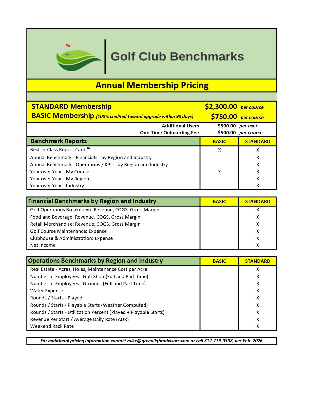 Greenlight Advisors offers two membership plans. BASIC ($750.00 per year) and STANDARD ($2,300.00 per year). The online benchmark reports for each plan are listed below. Both membership plans include the financial and operational benchmark “Best-in-Class Report Card”.